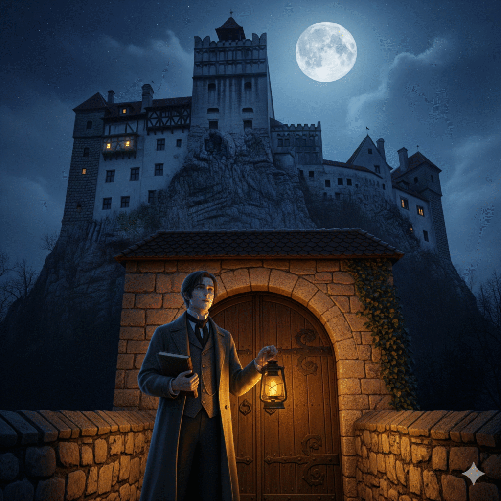 Count Dracula welcomes Jonathan inside. He was very polite but also very strange. He had a long white mustache and sharp nails.