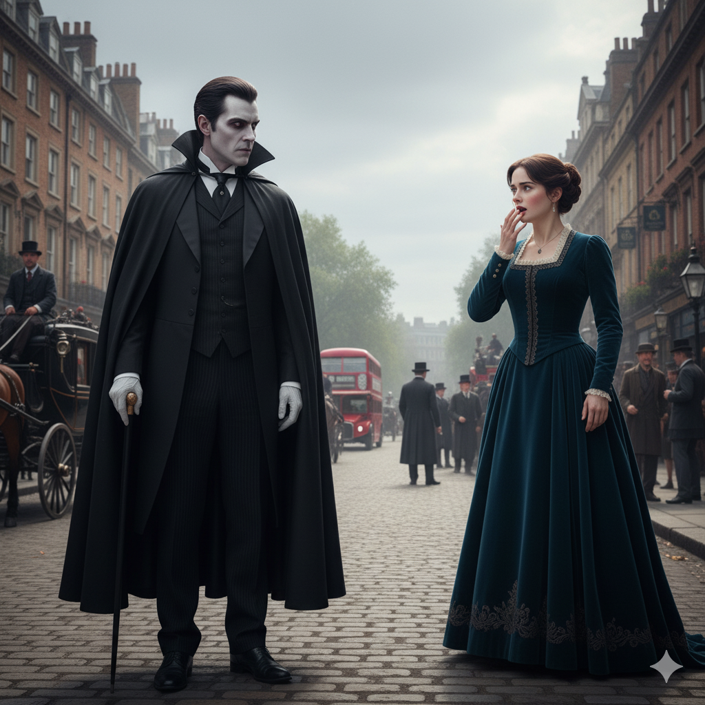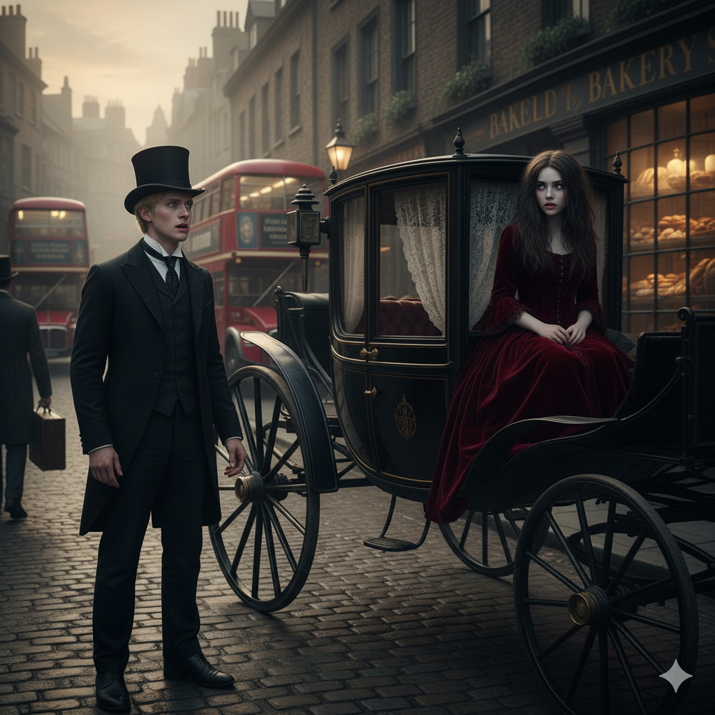 Suddenly Mina realized that Jonathan was looking at someone and he was looking very afraid. When she saw there a girl was waiting in the carrige outside the bakery.